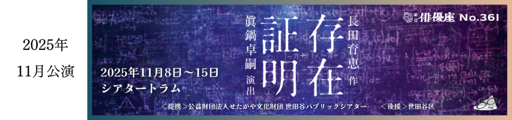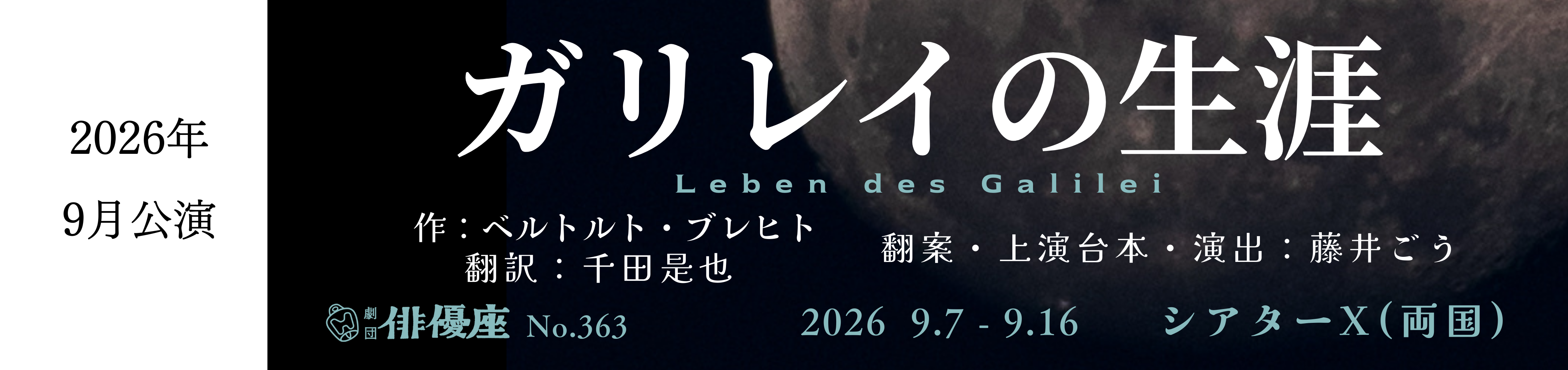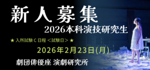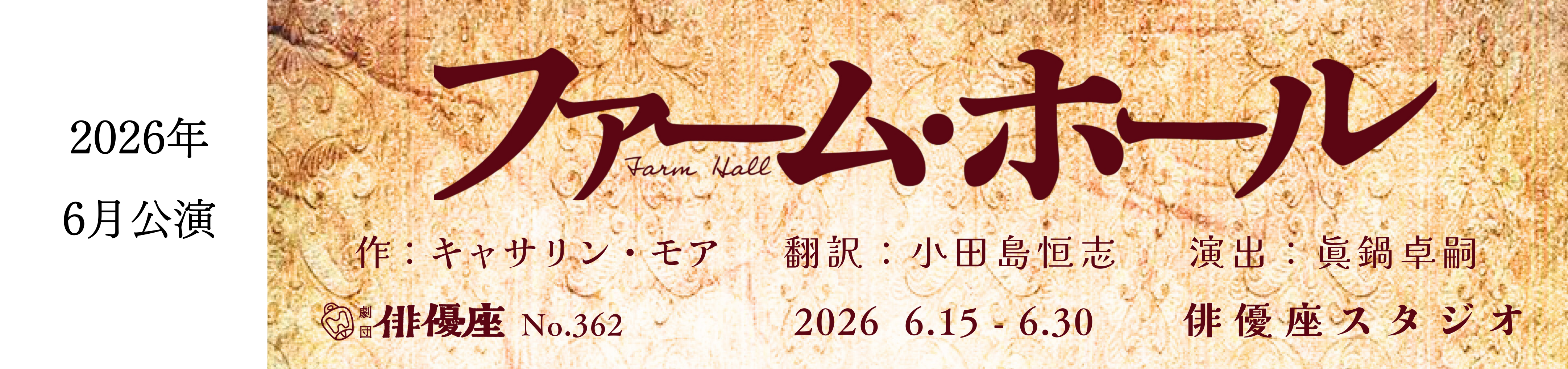 <Information> ★ 2026年度~2028年度公演ラインナップ公開! ★ 俳優座ギフトシートご支援・ご予約受付中! ★ 【受賞】岩崎加根子・眞鍋卓嗣が、第32回 読売演劇大賞 受賞! ★ 【受賞】岩崎加根子が第59回紀伊國屋演劇賞個人賞を受賞! ★ 『猫、獅子になる』第30回読売演劇大賞3部門受賞! ★ 「俳優座劇場 閉館について」劇団俳優座よりご報告