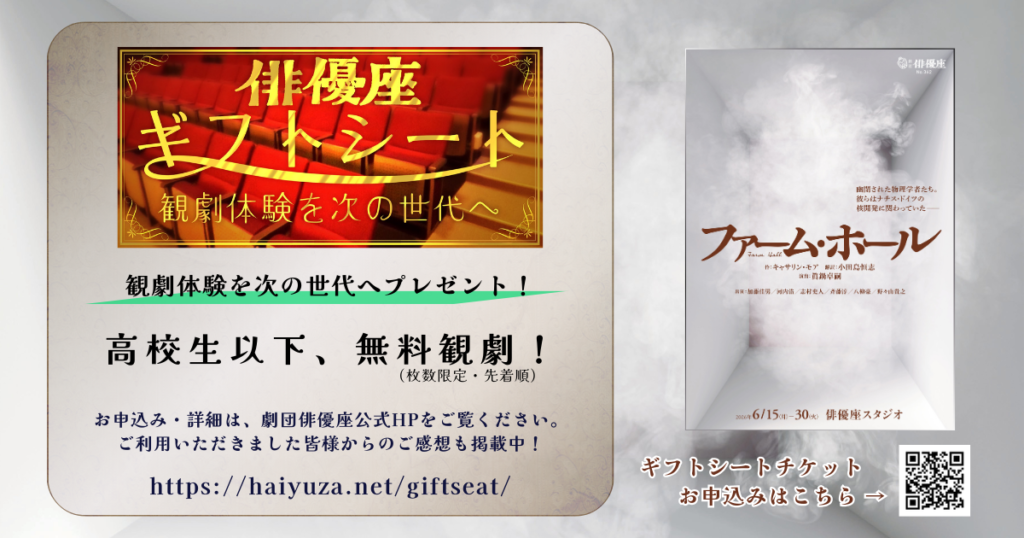 小中学生・高校生の皆様、ギフトシートチケットのご予約(枚数限定・先着順)で、劇団俳優座公演を無料観劇いただけます。ぜひご利用ください。