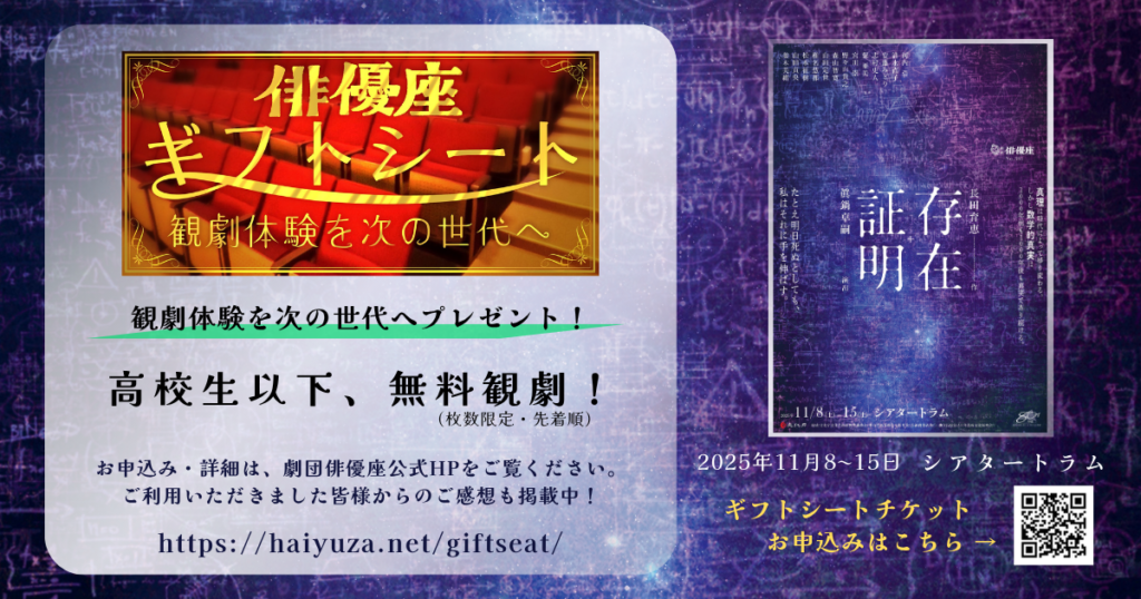 小中学生・高校生の皆様、ギフトシートチケットのご予約(枚数限定・先着順)で、劇団俳優座公演を無料観劇いただけます。ぜひご利用ください。