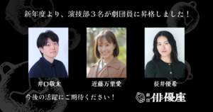 2026年4月1日 / 最終更新日 : 2026年4月1日 haiyuza お知らせ 新年度より、研究生4名が、準劇団員へ昇格しました! ◆ 演技部 小林明葉(こばやし あきは) 中村彩夏(なかむら あやか) 広江琉花(ひろえ るか) 森 夏子(もり なつこ) 小林明葉 中村彩夏 広江琉花 森夏子 2026年4月より、研究生4名が、準劇団員へ昇格しました。 今後の活躍にご期待ください! FacebookXBlueskyCopy