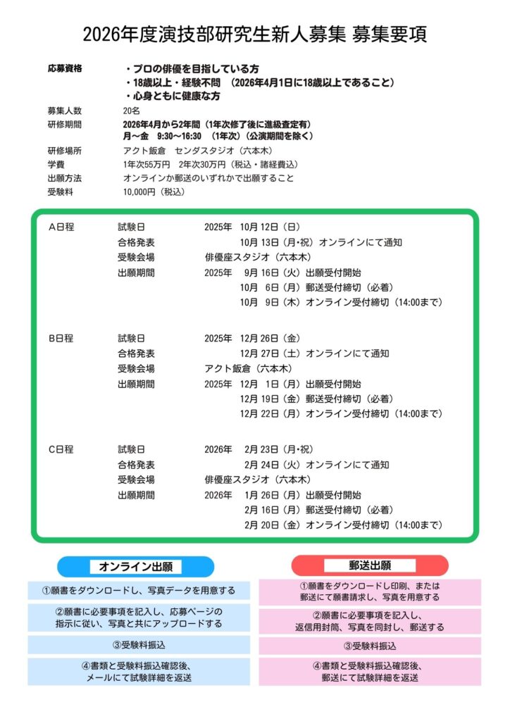 2026年度演技部研究生《A日程》《B日程》は終了しました。