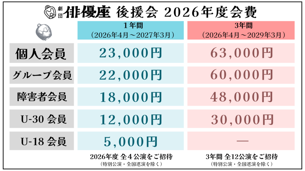 2026年度4月1日より俳優座の主催する本公演、LABO公演、後援会費の料金を改定いたします。