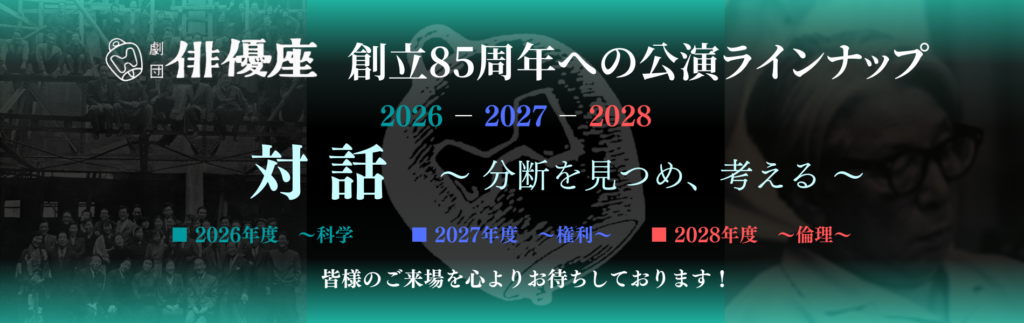 劇団俳優座では、更に85周年へ向けて、3年間のコンセプトを『対話 ~分断を見つめ、考える』とし、三つのキーワードのもと12作品をお届けいたします。また、全国巡演も続けながら、この先の90周年100周年へと歩みを止めず、皆様と共に進んで参ります。